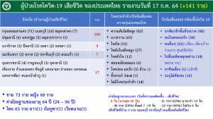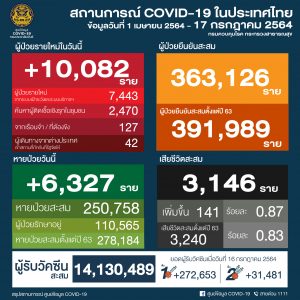 โดยผู้ติดเชื้อรายใหม่ 10,082 คนแยกเป็น ผู้ติดเชื้อที่เดินทางกลับจากต่างประเทศเข้า State Quarantine 42 คน ผู้ติดเชื้อภายในประเทศ จำนวน 10,082 คน ติดเชื้อในเรือนจำ 127 คน ตรวจหาเชื้อเชิงรุก 2,470 คน ตรวจหาเชื้อโดยผู้ติดเชื้อเดินทางไปตรวจที่โรงพยาบาล 7,443 คน ผู้ป่วยรักษาอยู่ที่โรงพยาบาล 63,542 คน ที่โรงพยาบาลสนาม 47,023 อาการหนัก 3,454 คน ใส่เครื่องช่วยหายใจ 839 คน เสียชีวิต 141 ราย