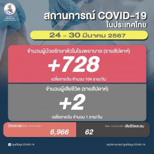 โควิดในไทย “24 – 30 มี.ค. 67” ติดเชื้อรายใหม่ 728 ราย เฉลี่ยรายวัน 104 ราย